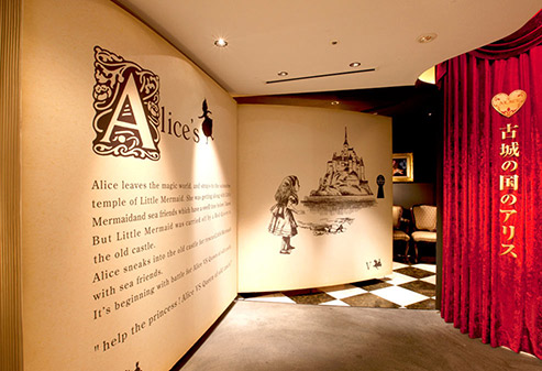 エントランスに現れたのは大きな本の扉。ページをめくるように入口のドアを開けたとたん、あなたはハートの女王の古き城に迷い込みます。 レンガで造られた通路を抜けた先は、女王の煌びやかな「クリスタル舞踏会」の会場。 フロアの中央には、シャンデリアの中で幻想的なひとときが過ごせる「ビッグシャンデリアシート」があり、その他、 鏡に囲まれた「魔法の鏡のドレスルーム」や女王の休息の間をイメージした「赤の寝室」など赤と黒を基調としたゴージャスな女王の城内を体験できます。 また、離れの空間には、水槽に囲まれた「海の神殿」があり、まるで海底にいるかのような神秘的な空間。中でも「人魚の洞窟」は、個室のプラチナルームとなっております。
